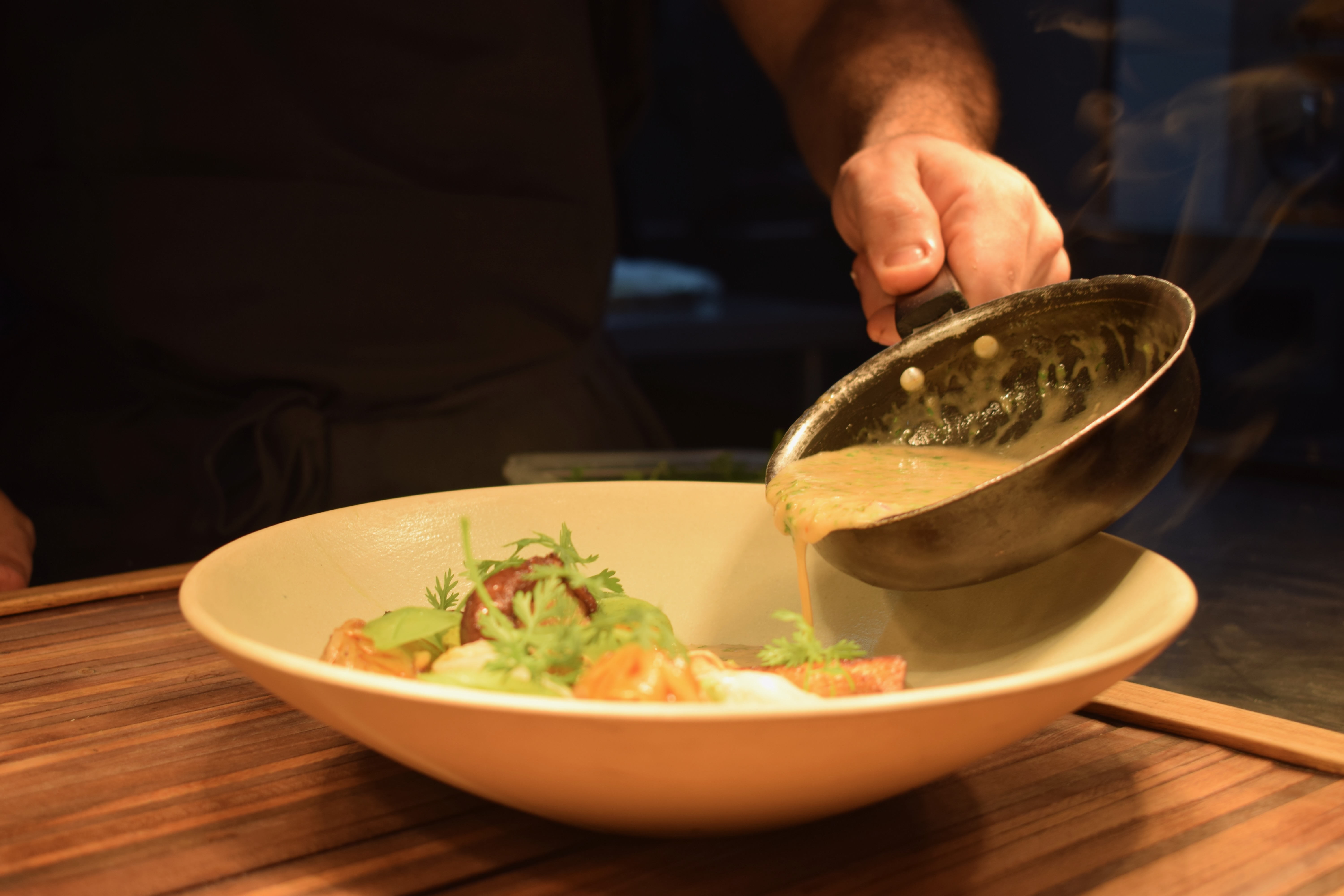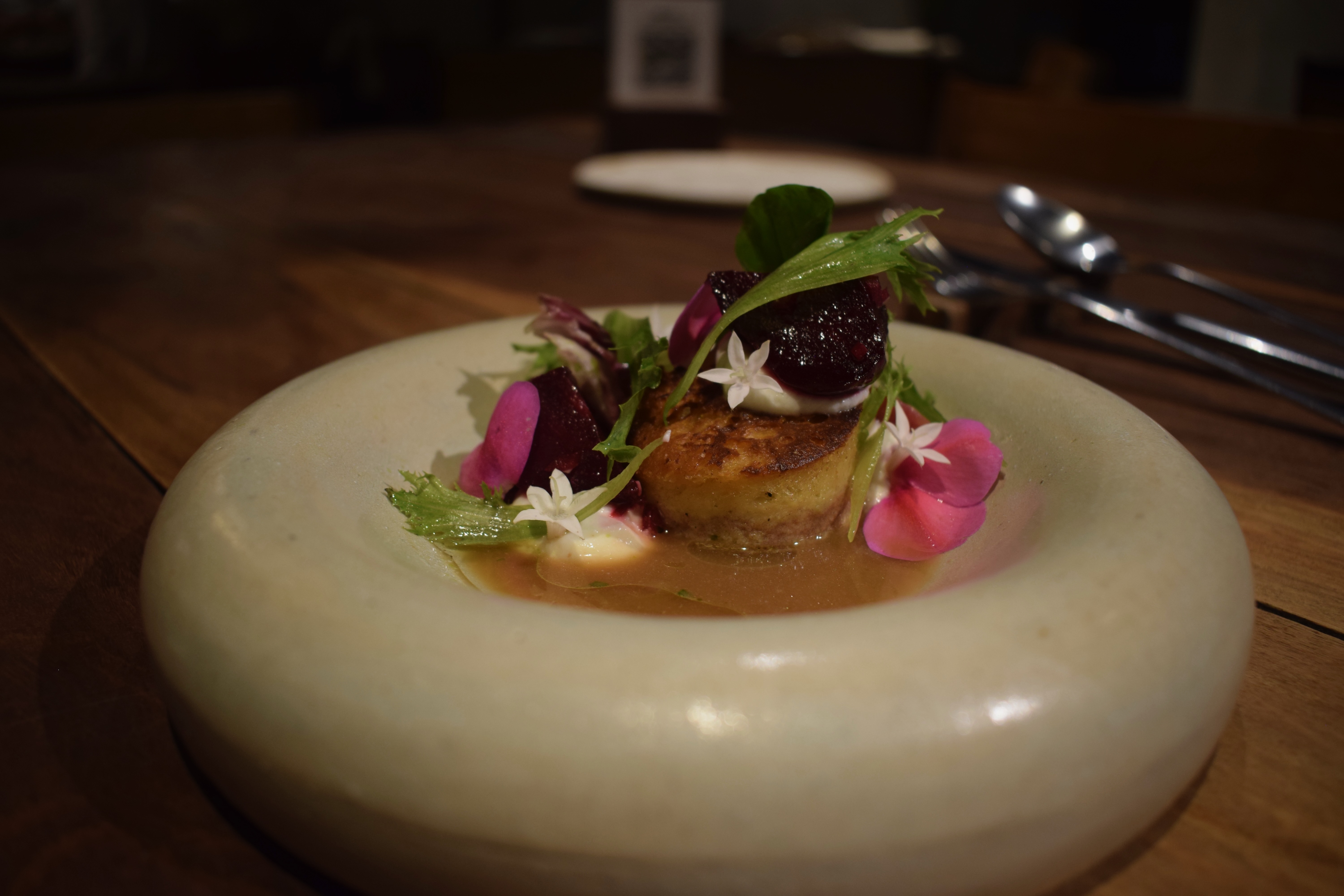 The meal begins with an understated touch of theatre: the signature starter, a delicate but warming laying-hen and lambretta mussel broth, is poured over a bouquet of fresh herbs right at your table.