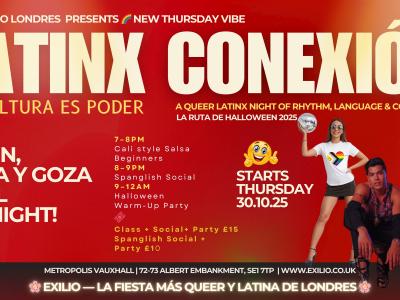 04/12/2025 19:00 PM - 05/12/2025 00:00 AMStep into Latinx Conexión — London’s newest queer Latin night where culture, rhythm and language collide. From Cali-style salsa for beginners to Spanglish socials and tropical beats till midnight, Exilio brings you a night of…