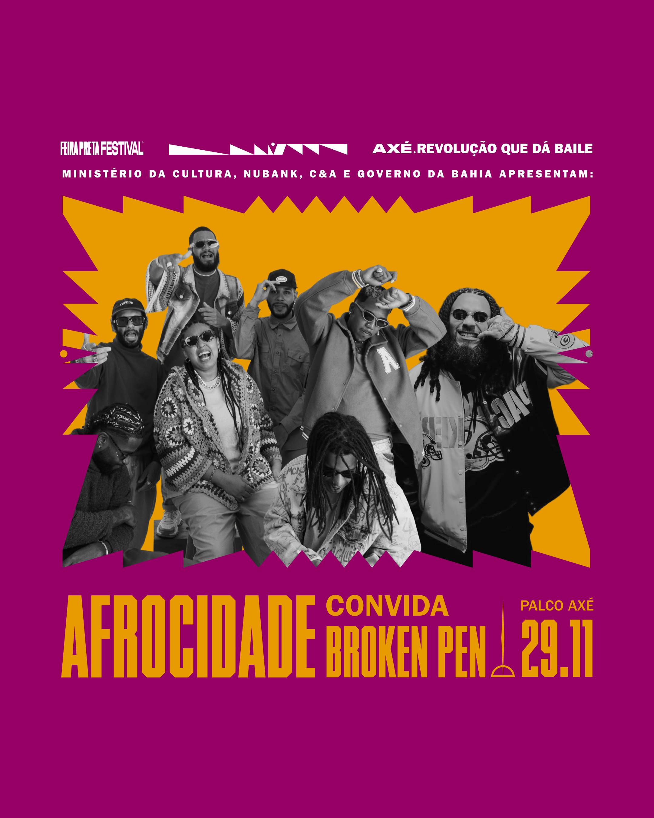 For Afrocidade, creativity is born from collective energy — a euphoric exchange between band and audience that shapes their sound. “Live experiences are our strongest foundation,” says Mazzone (vocals, musical direction, drums). “That’s where we build our art and share energy. Our event Afrobaile is proof of that.”