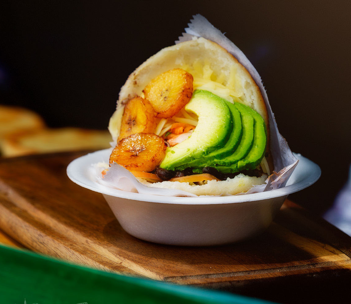 Quinoa Arepa is based on multi Quinoa grains and maca , corn blended plus harina de pan we offer vegan, vegetarian, chicken, and beed, filled with fresh avocado sauce ,plantains, and rocoto limana sauce.