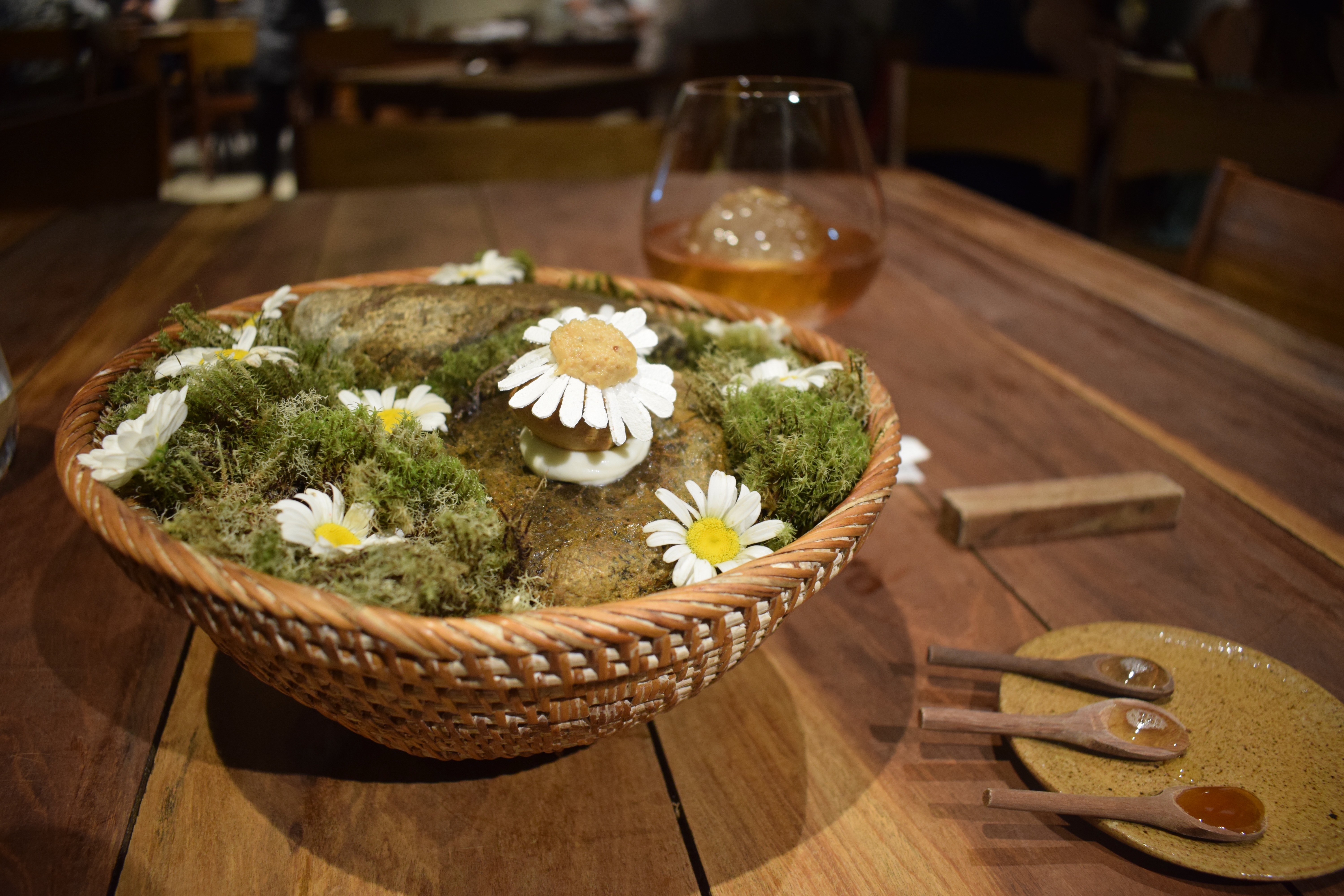One of three desserts, a choux, nestles in a basket-like floral arrangement, accompanied by different Bahian honeys, all sumptious variations of liquid silk produced Bahia's unique native, stingless species (Meliponini).