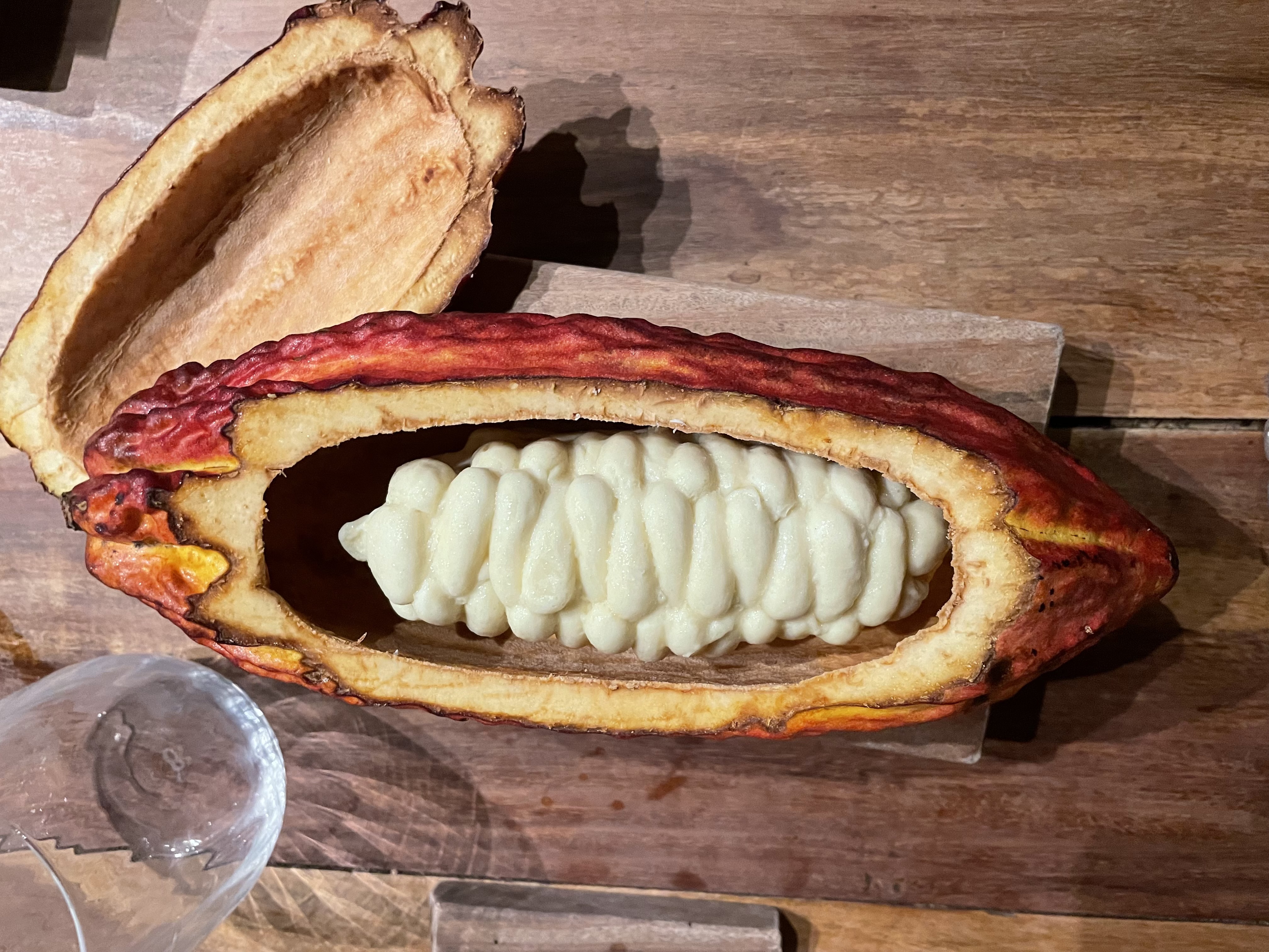 Kafe's playful ingenuity is nowhere more present than in another of her sweet inventions, a life size cacao bean (which is fairly large) in a cacao pod. Or so I thought. The 'bean' turned out to be a mould of white chocolate, so realistic, I wasn't quite sure how to eat it. Once instructed how to crack it, a sublime raspberry mouse burst out, revelaing one fo the most delicious deserts I've ever had.